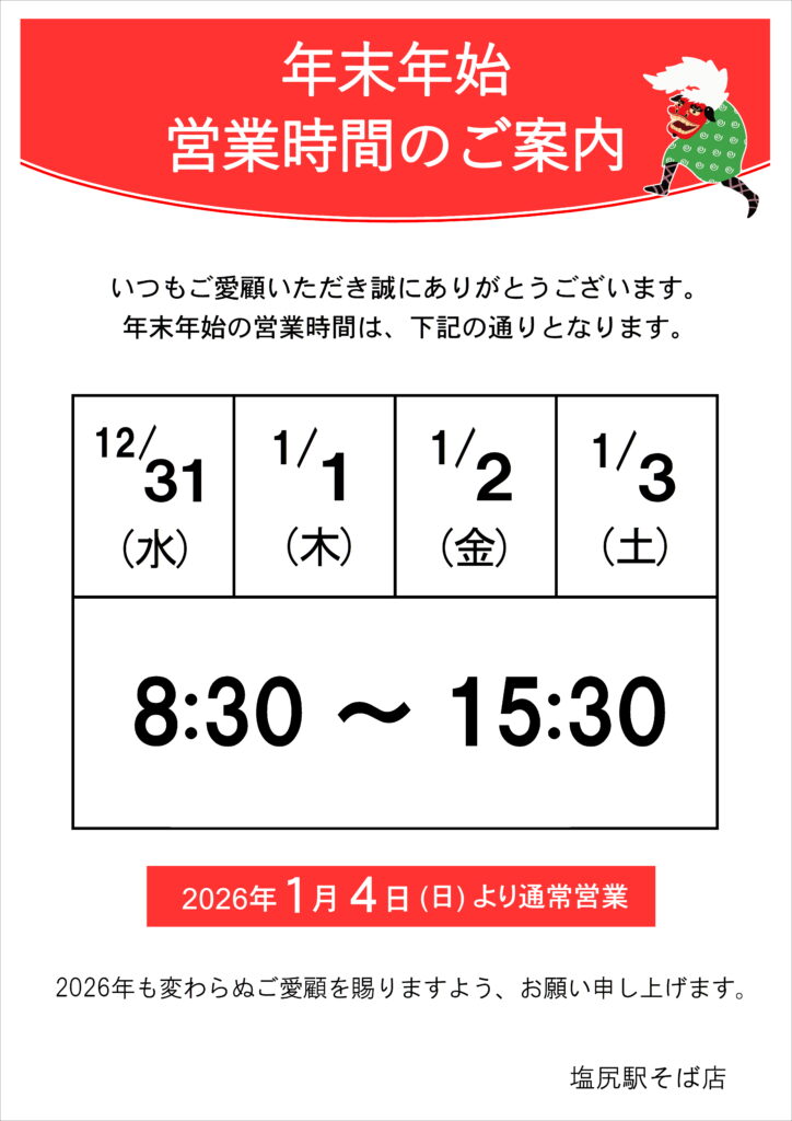 【そば処桔梗】年末年始営業のご案内