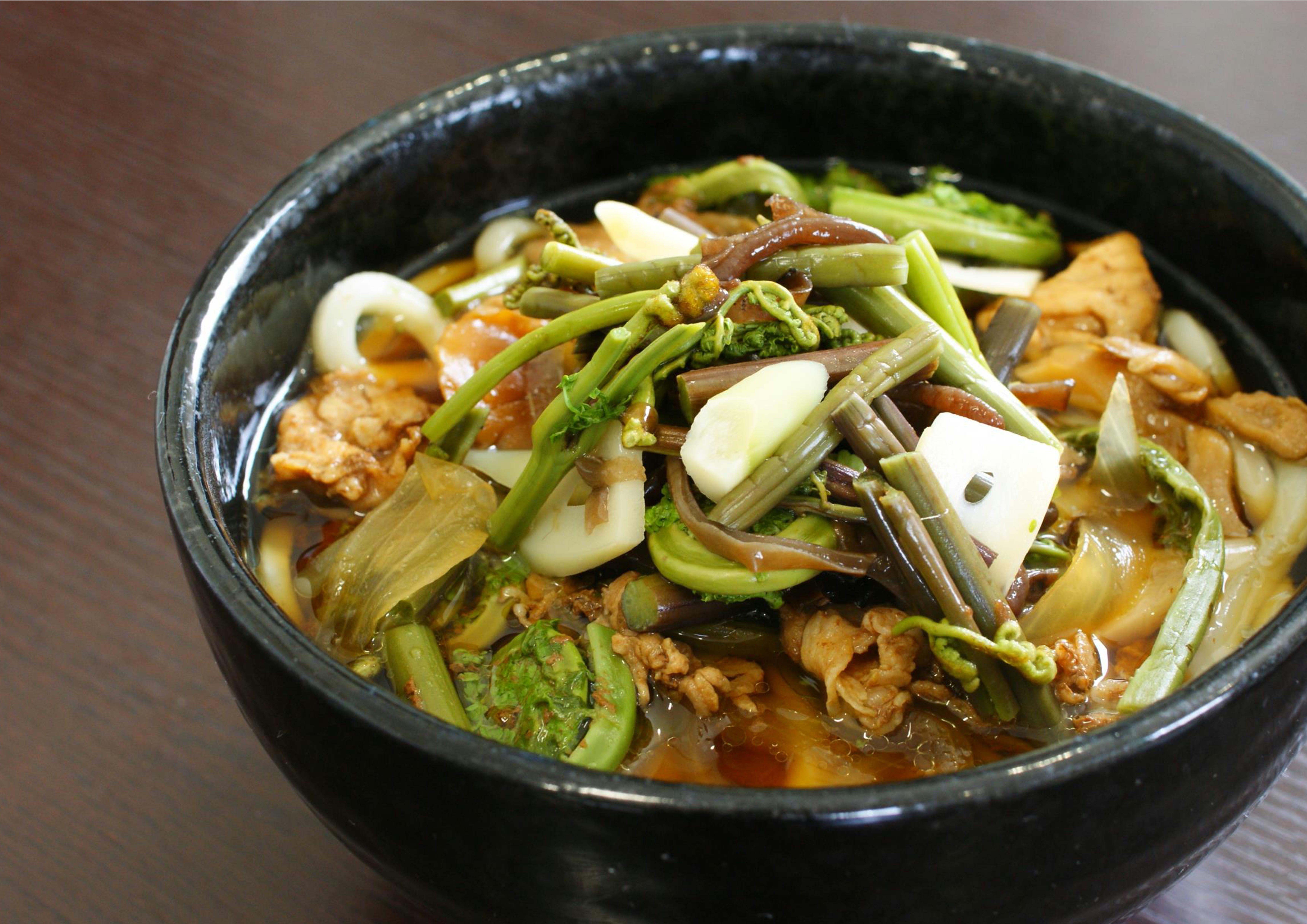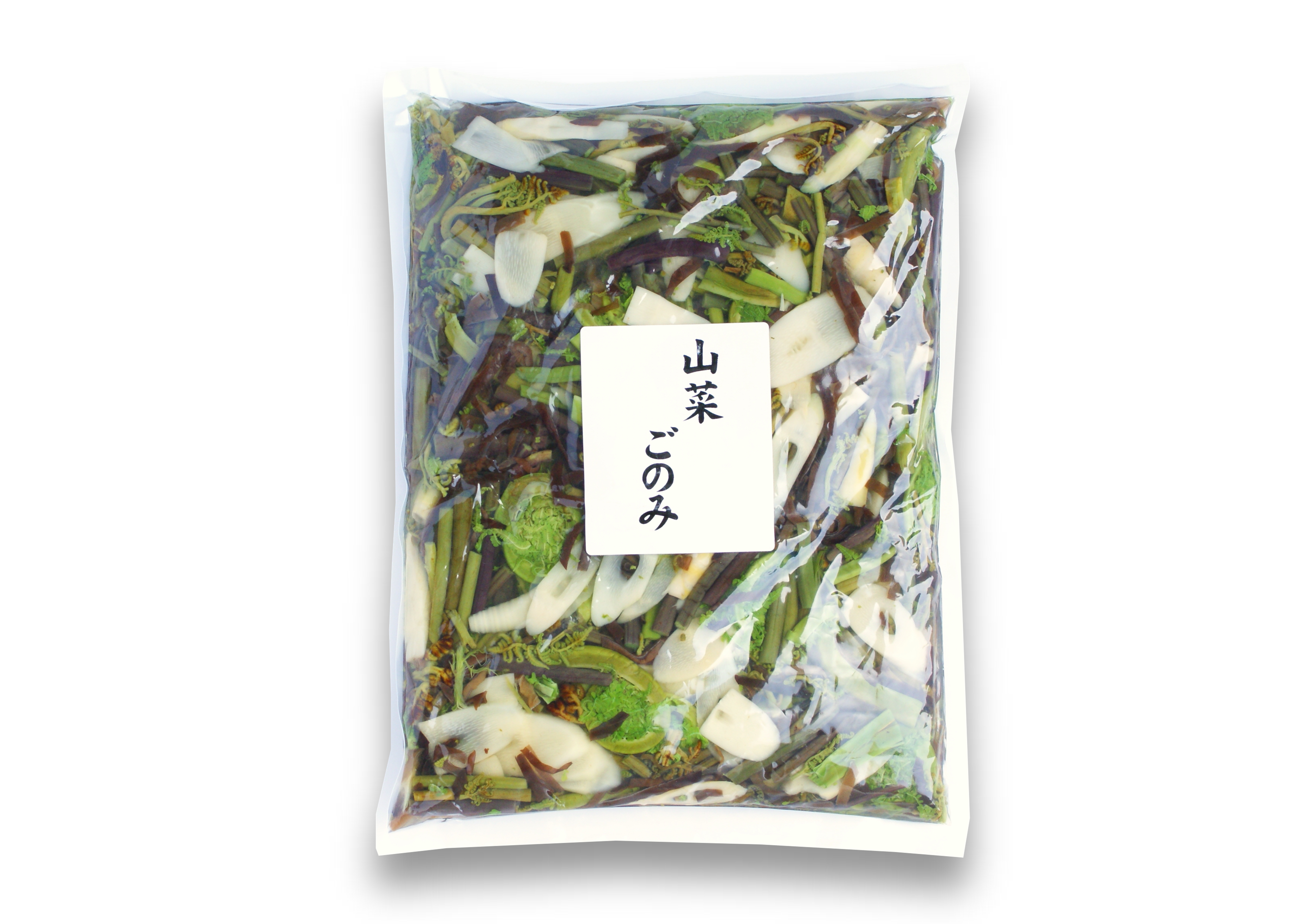 わらび、細竹、こごみ、木耳をオリジナルで味付けしミックスしました。大根おろしを添えて一品、そばやうどんのトッピング、炊き込みごはんなどにご活用いただけます。